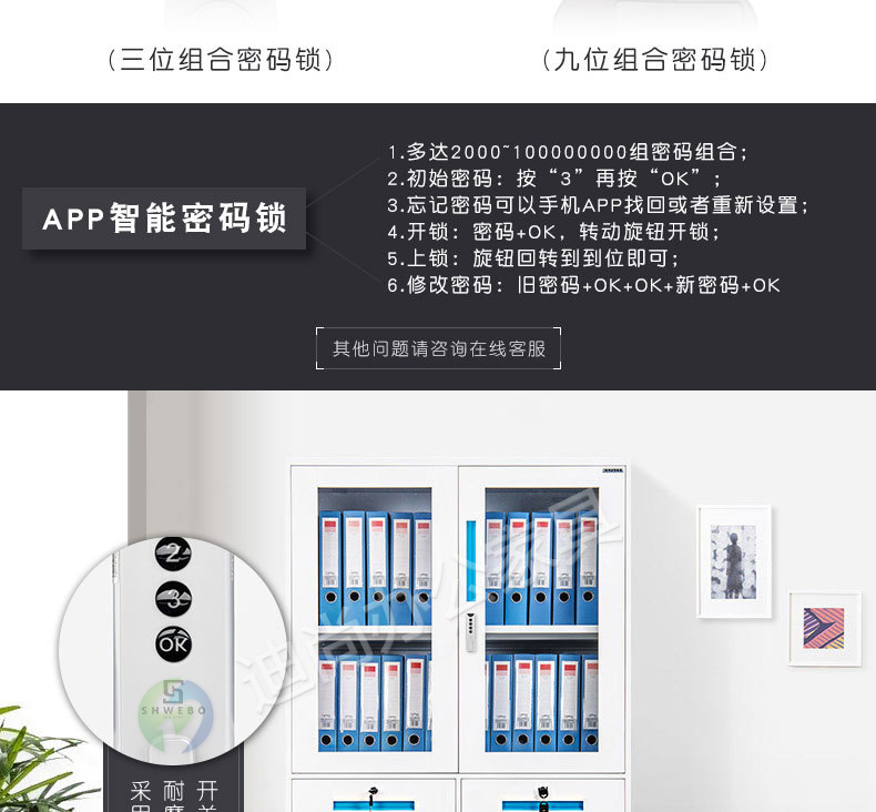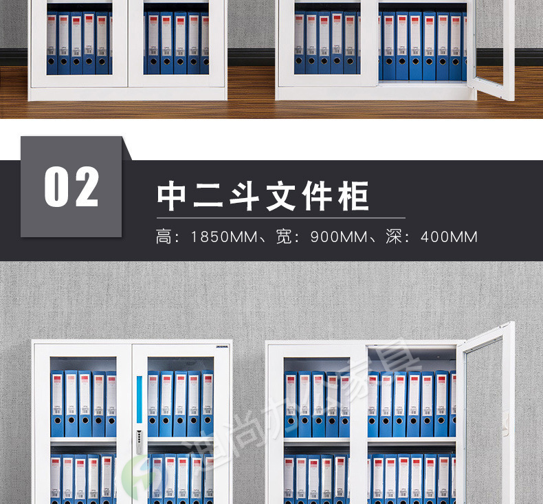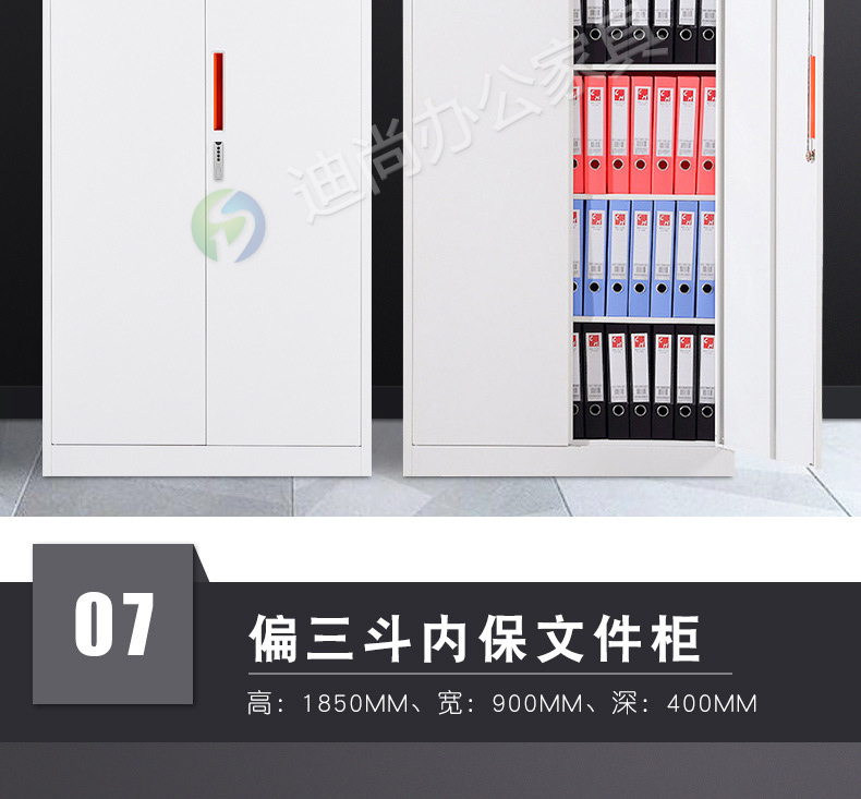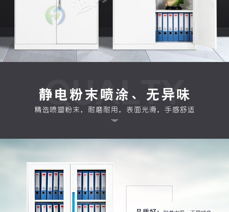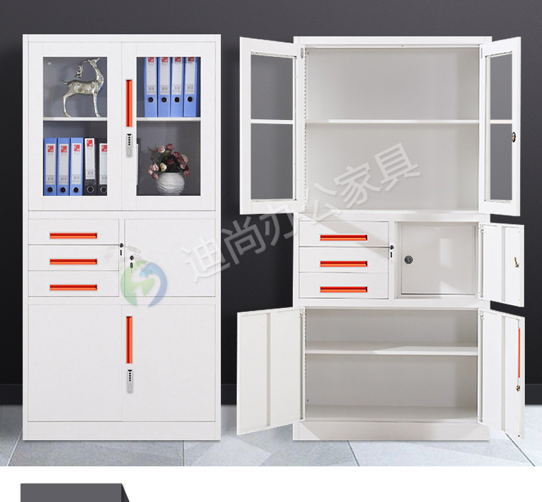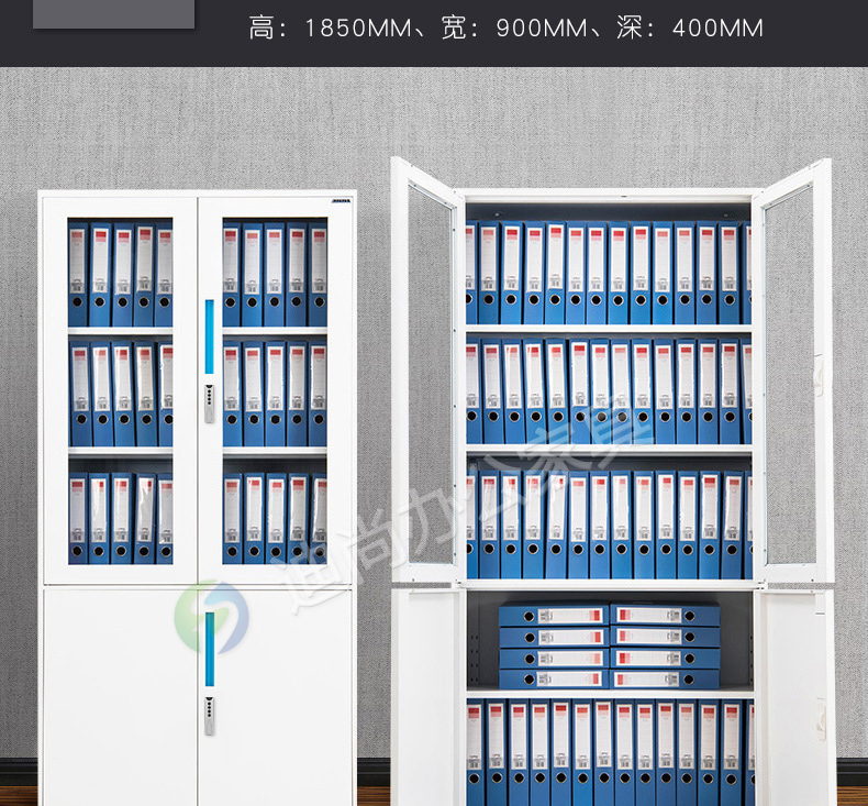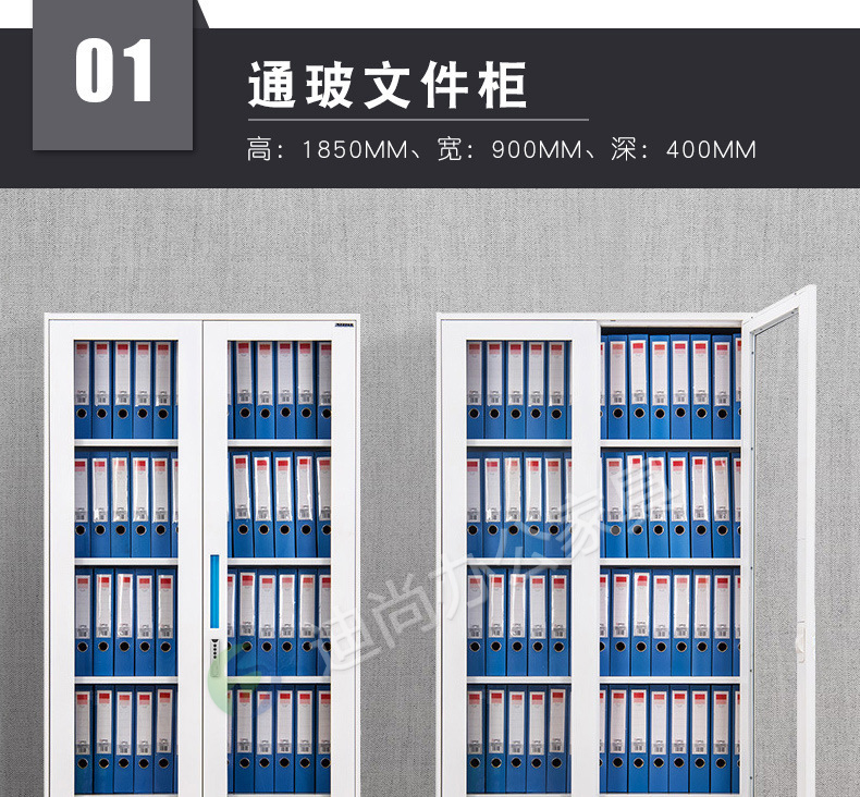 外观专利拉手+钢化玻璃 采用优质冷轧钢板经剪切,冲压,折弯,焊接,装配等九工位精制而成 采用自动喷淋式磷化 粉末静电喷涂,涂膜不易脱落,环保耐用,无毒害,无气味,光洁美观 外观精美,安全系数良好 坚固耐用,承受力强,可存放大量文件资料不变形