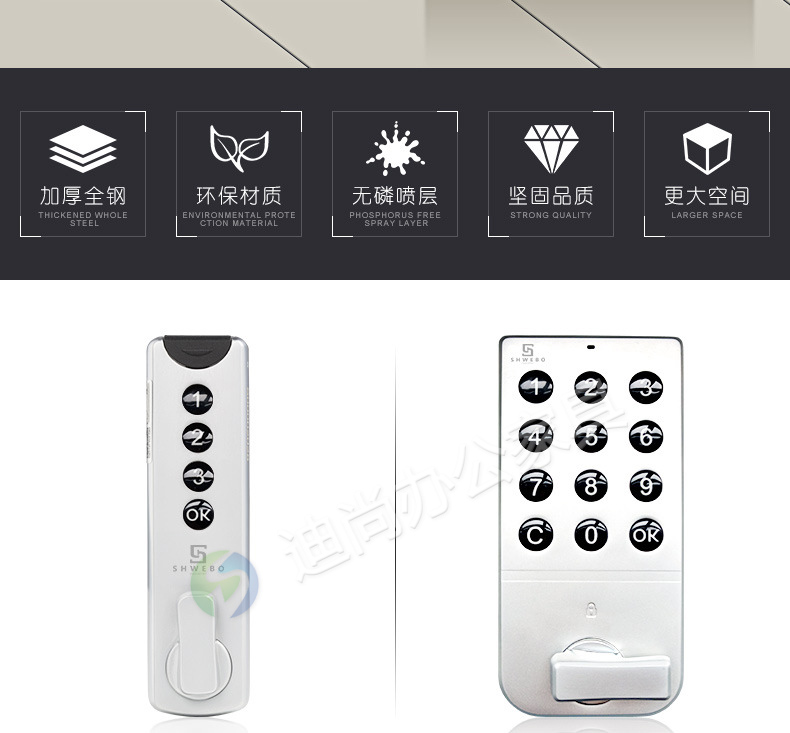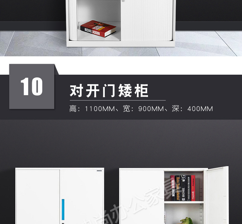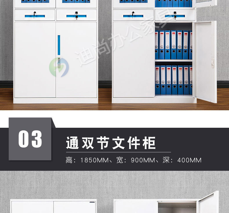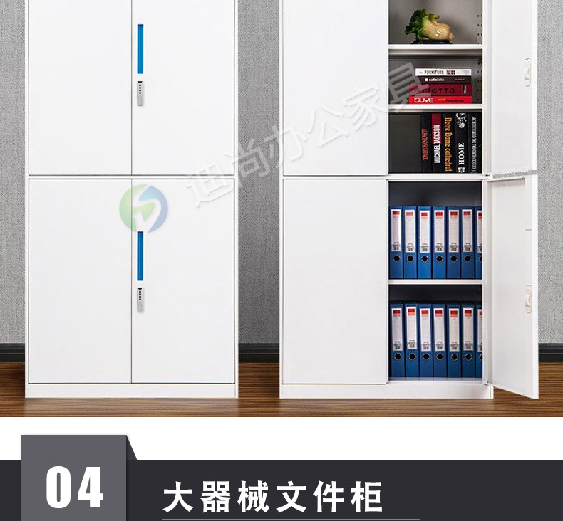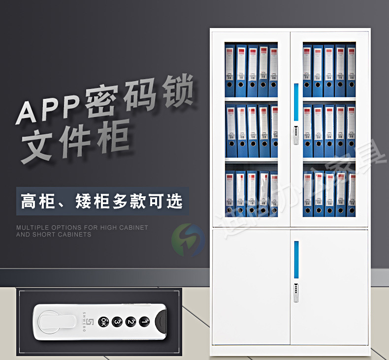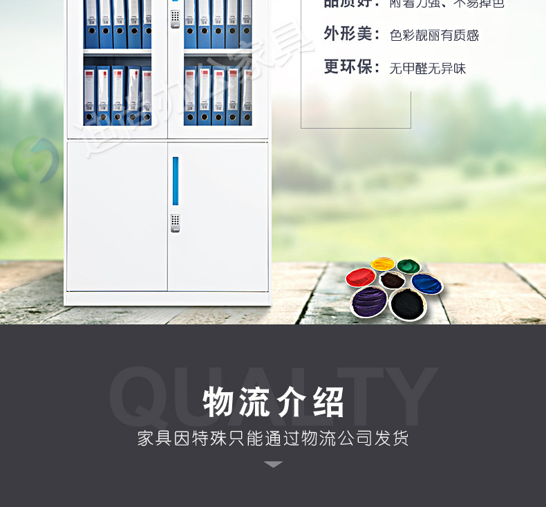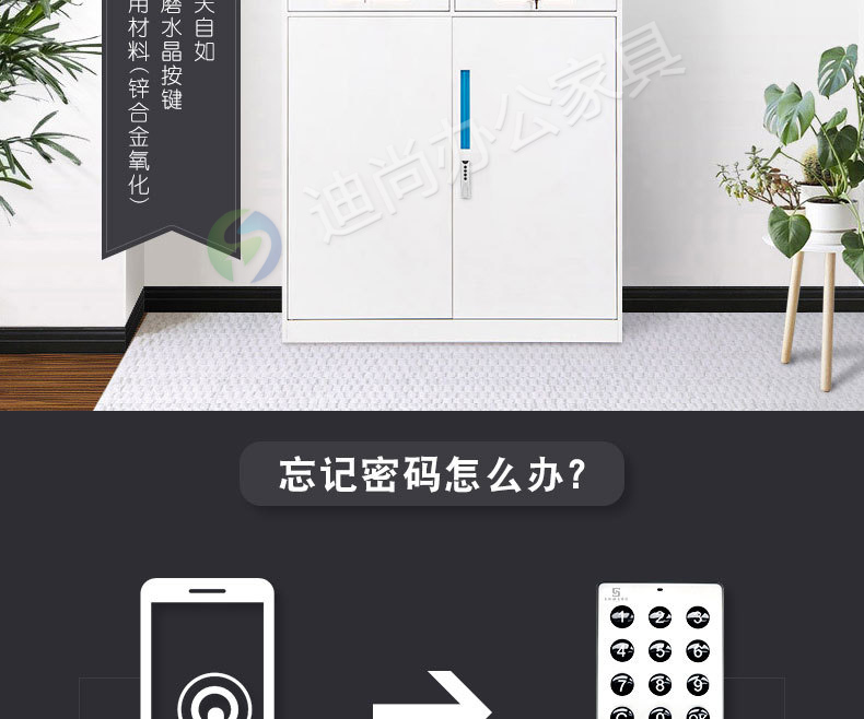 外观专利拉手+钢化玻璃 采用优质冷轧钢板经剪切,冲压,折弯,焊接,装配等九工位精制而成 采用自动喷淋式磷化 粉末静电喷涂,涂膜不易脱落,环保耐用,无毒害,无气味,光洁美观 外观精美,安全系数良好 坚固耐用,承受力强,可存放大量文件资料不变形