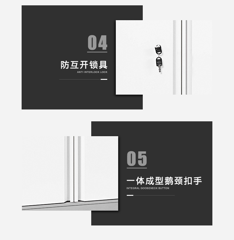 外观专利拉手+钢化玻璃 采用优质冷轧钢板经剪切,冲压,折弯,焊接,装配等九工位精制而成 采用自动喷淋式磷化 粉末静电喷涂,涂膜不易脱落,环保耐用,无毒害,无气味,光洁美观 外观精美,安全系数良好 坚固耐用,承受力强,可存放大量文件资料不变形