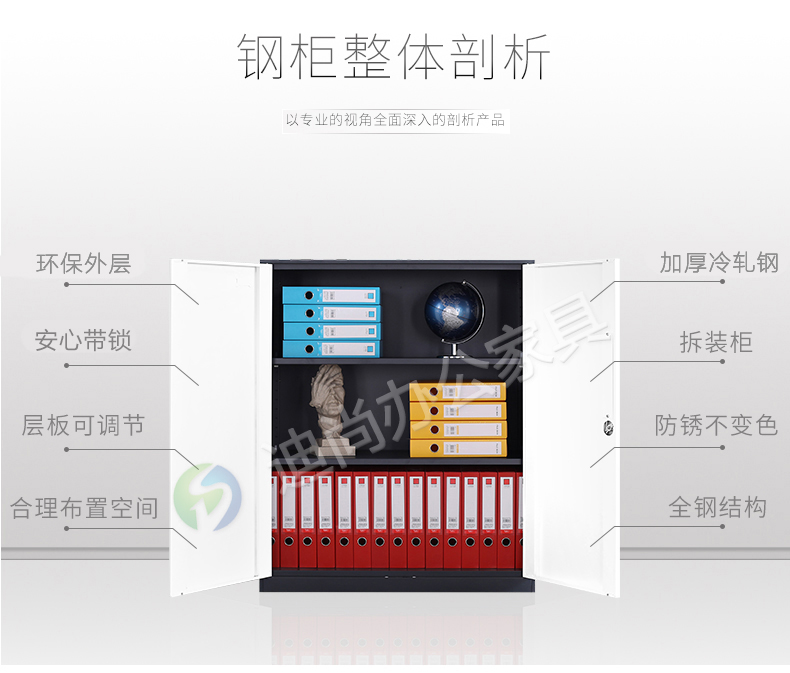 采用优质冷轧钢板经剪切,冲压,折弯,焊接,装配等九工位精制而成 采用自动喷淋式磷化 粉末静电喷涂,涂膜不易脱落,环保耐用,无毒害,无气味,光洁美观 外观精美,安全系数良好 坚固耐用,承受力强,可存放大量文件资料不变形