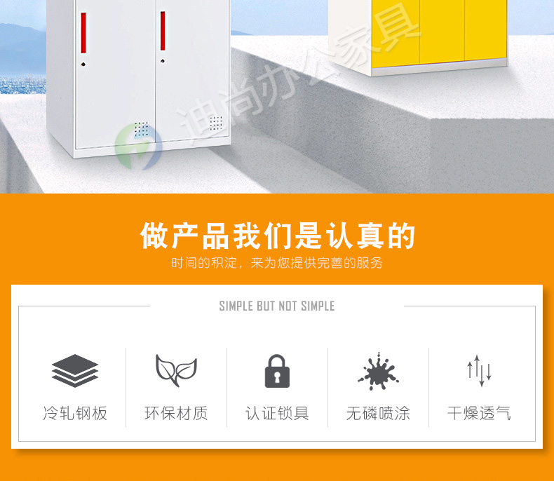采用优质冷轧钢板经剪切,冲压,折弯,焊接,装配等九工位精制而成 采用自动喷淋式磷化 粉末静电喷涂,涂膜不易脱落,环保耐用,无毒害,无气味,光洁美观 外观精美,安全系数良好 坚固耐用,承受力强,可存放大量文件资料不变形