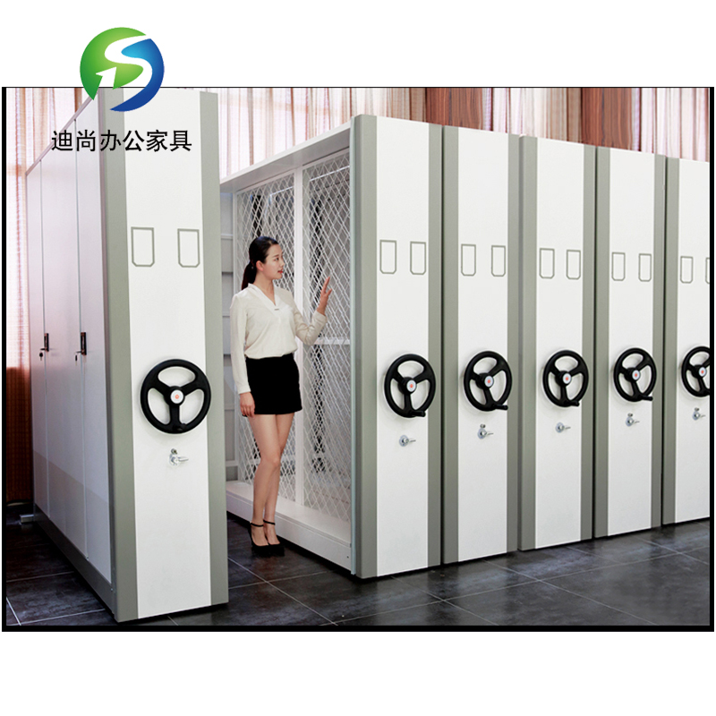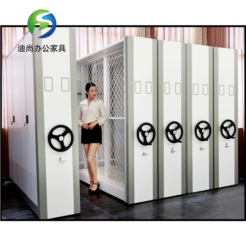 节型、架宽、层数和列数均可按用户需求选定 每列密集架均装有制动装置,开闭方便。开架查取资料只需按下制动把手,架体不会被他人移动,可有效保证查阅人员的人全 集架采用整块经过巧妙设计的侧板代替立柱 采用白色或黑色圆盘及手摇杆,只用两个手指即可转动整列密集架,轻便灵活
