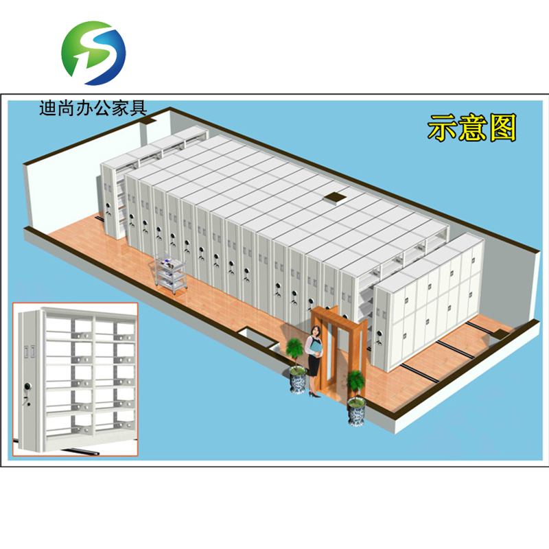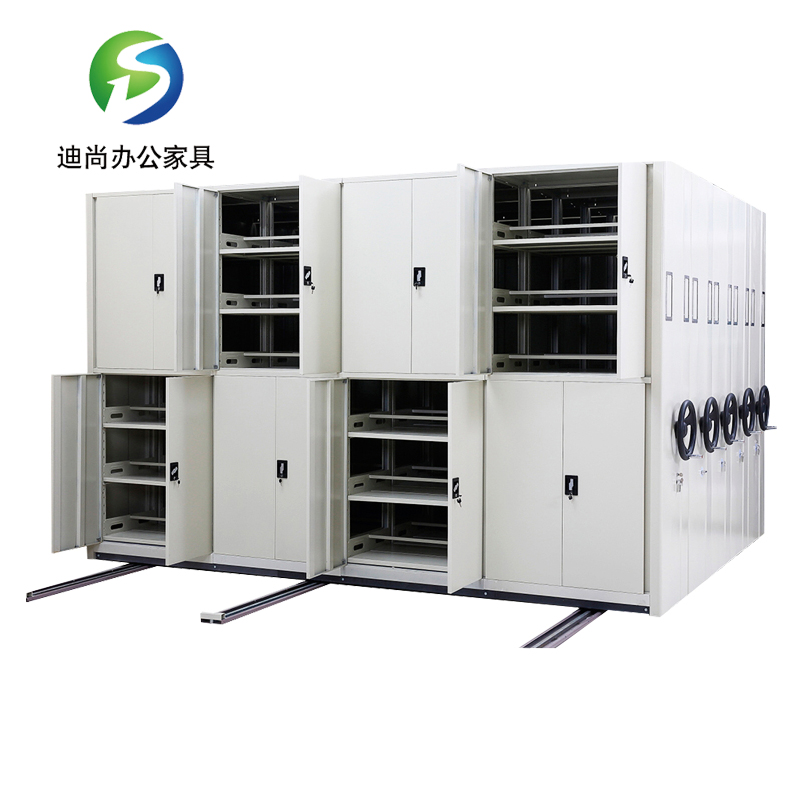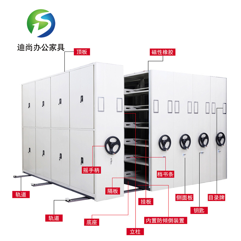 节型、架宽、层数和列数均可按用户需求选定 每列密集架均装有制动装置,开闭方便。开架查取资料只需按下制动把手,架体不会被他人移动,可有效保证查阅人员的人全 集架采用整块经过巧妙设计的侧板代替立柱 采用白色或黑色圆盘及手摇杆,只用两个手指即可转动整列密集架,轻便灵活