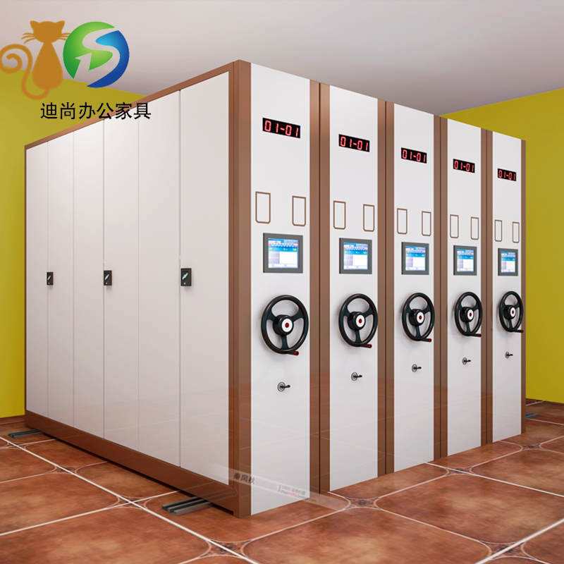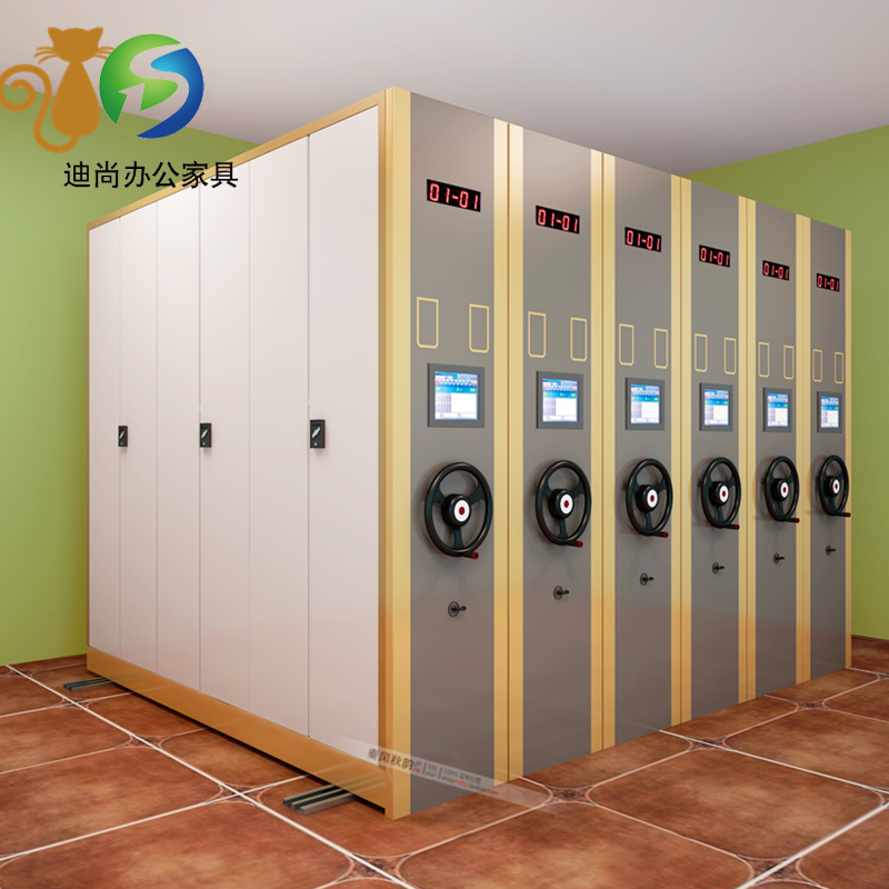 节型、架宽、层数和列数均可按用户需求选定 每列密集架均装有制动装置,开闭方便。开架查取资料只需按下制动把手,架体不会被他人移动,可有效保证查阅人员的人全 集架采用整块经过巧妙设计的侧板代替立柱 采用白色或黑色圆盘及手摇杆,只用两个手指即可转动整列密集架,轻便灵活