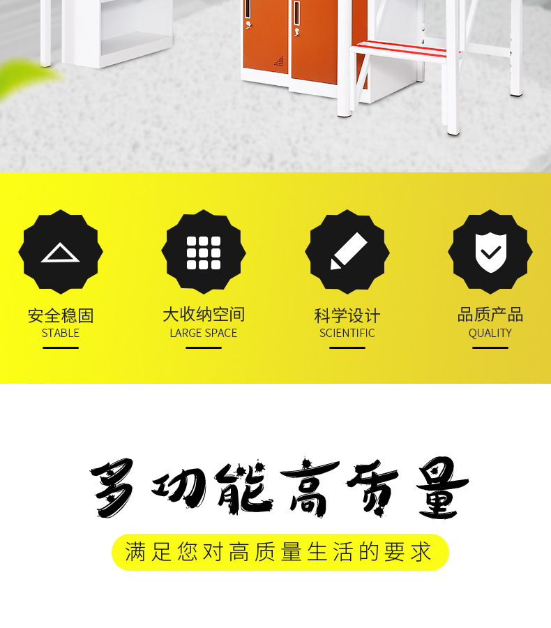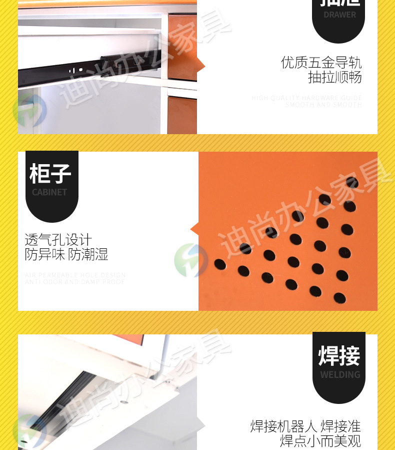 采用优质冷轧钢板经剪切,冲压,折弯,焊接,装配等九工位精制而成 采用自动喷淋式磷化 粉末静电喷涂,涂膜不易脱落,环保耐用,无毒害,无气味,光洁美观 外观精美,安全系数良好 坚固耐用,承受力强,可存放大量文件资料不变形