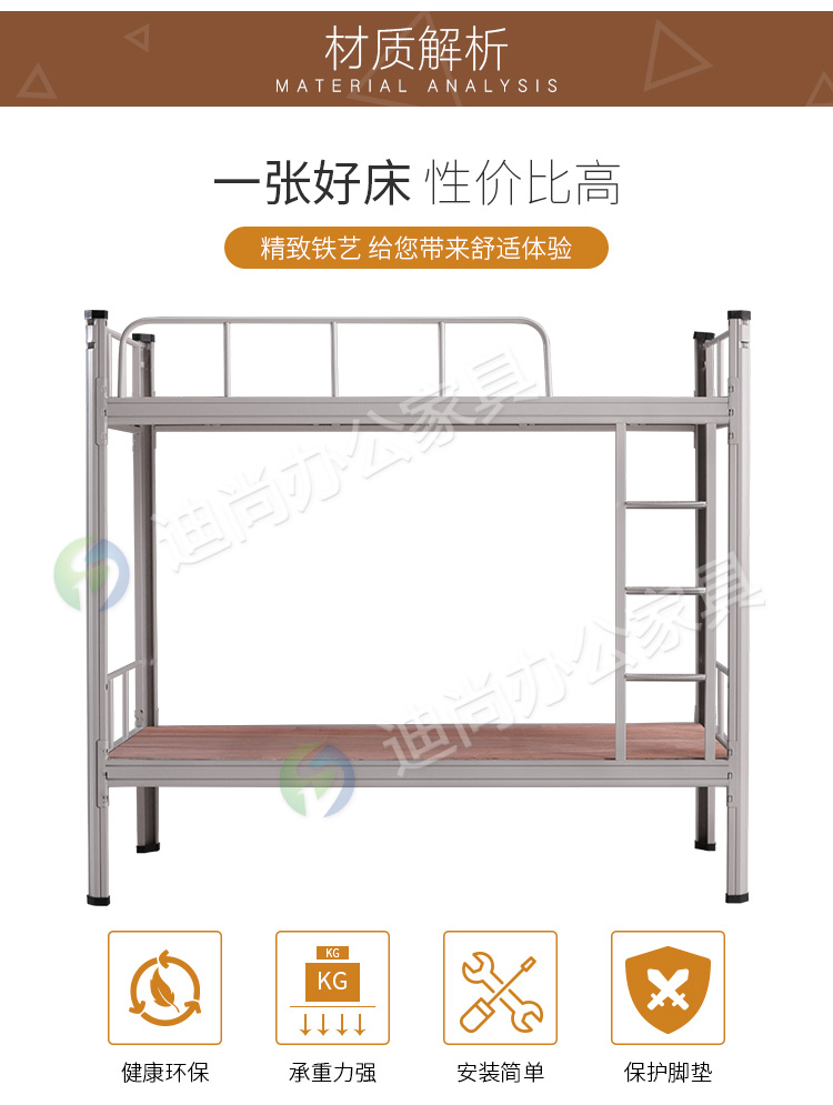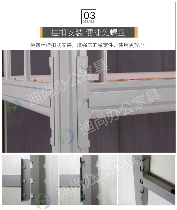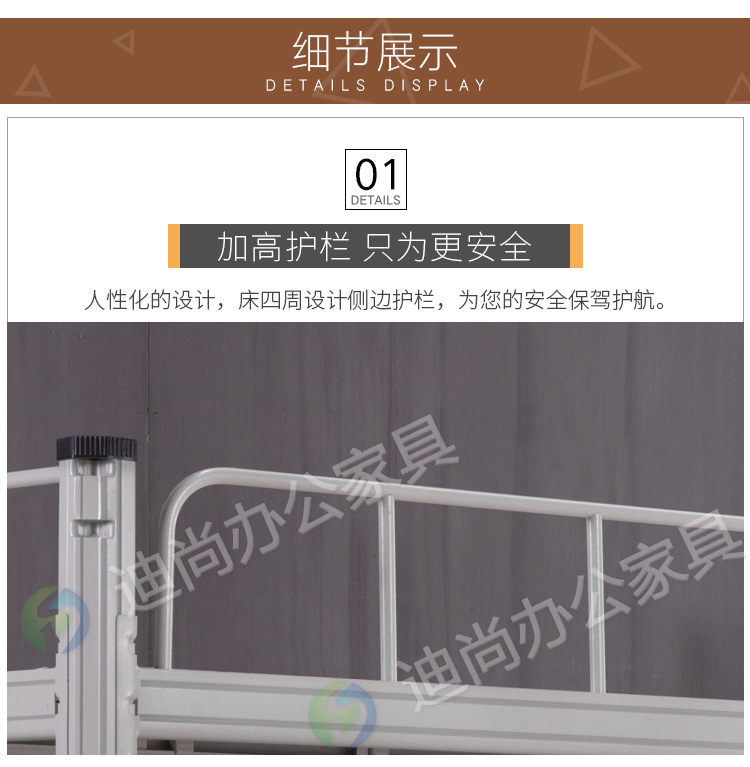 型材立柱、床帮 采用优质冷轧钢板经剪切,冲压,折弯,焊接,装配等九工位精制而成 采用自动喷淋式磷化 粉末静电喷涂,涂膜不易脱落,环保耐用,无毒害,无气味,光洁美观 外观精美,安全系数良好 坚固耐用,承受力强,可存放大量文件资料不变形