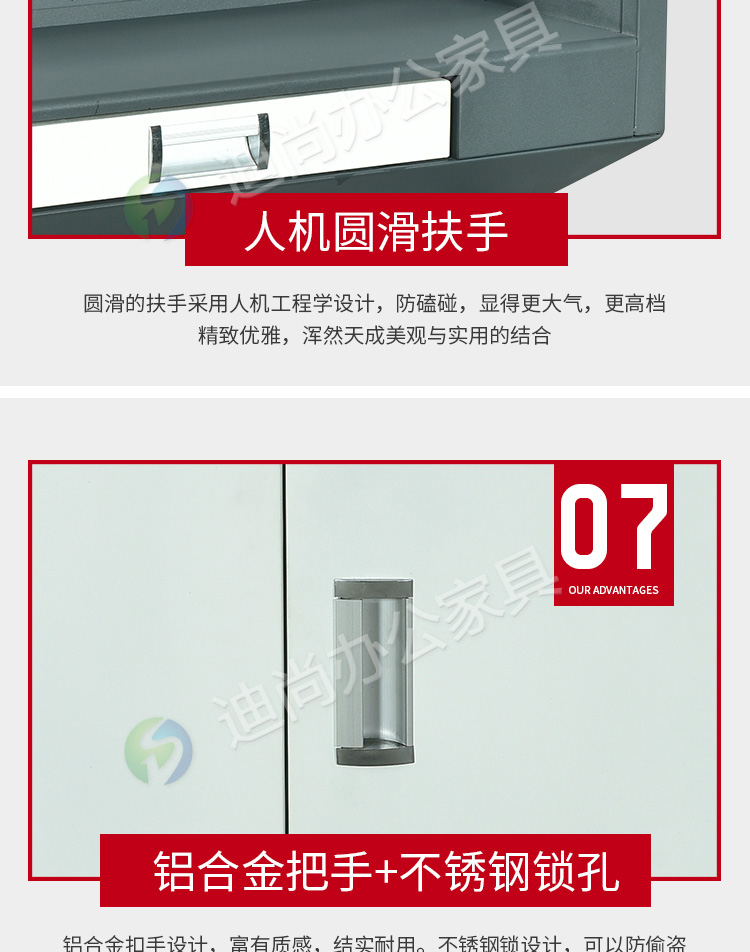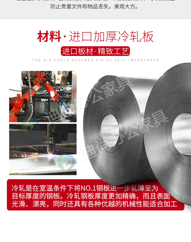 采用优质冷轧钢板经剪切,冲压,折弯,焊接,装配等九工位精制而成 采用自动喷淋式磷化 粉末静电喷涂,涂膜不易脱落,环保耐用,无毒害,无气味,光洁美观 外观精美,安全系数良好 坚固耐用,承受力强,可存放大量文件资料不变形