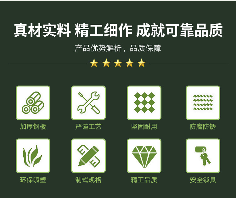 采用优质冷轧钢板经剪切,冲压,折弯,焊接,装配等九工位精制而成 采用自动喷淋式磷化 粉末静电喷涂,涂膜不易脱落,环保耐用,无毒害,无气味,光洁美观 外观精美,安全系数良好 坚固耐用,承受力强,可存放大量文件资料不变形