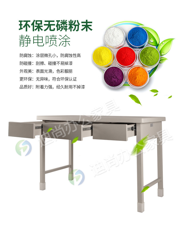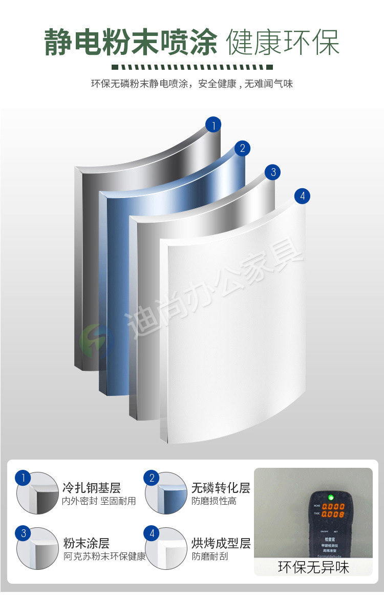 采用优质冷轧钢板经剪切,冲压,折弯,焊接,装配等九工位精制而成 采用自动喷淋式磷化 粉末静电喷涂,涂膜不易脱落,环保耐用,无毒害,无气味,光洁美观 外观精美,安全系数良好 坚固耐用,承受力强,可存放大量文件资料不变形