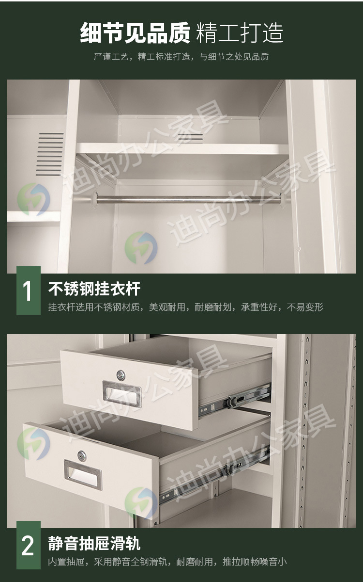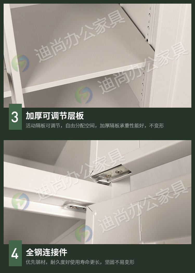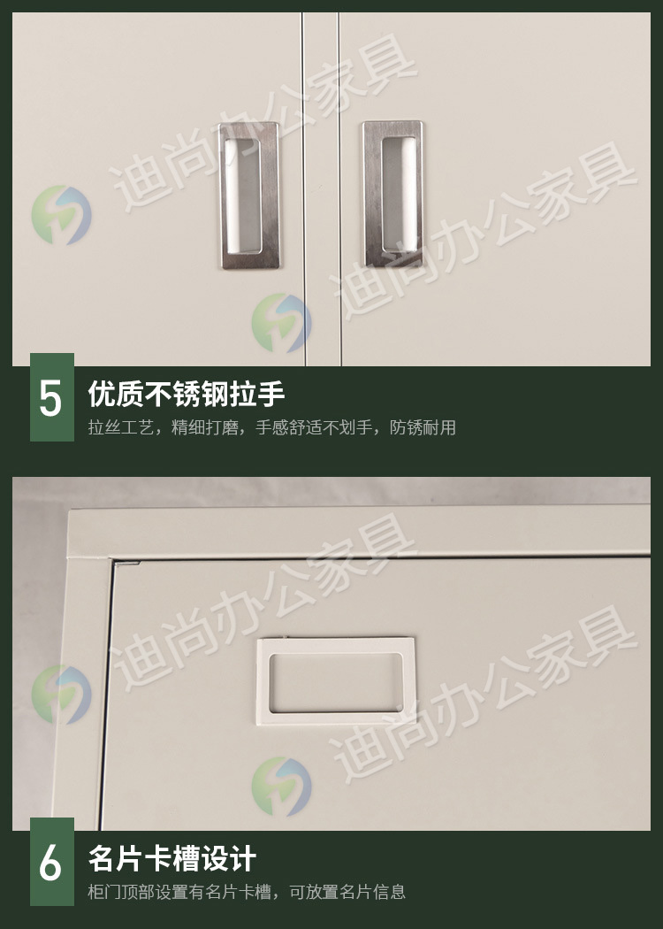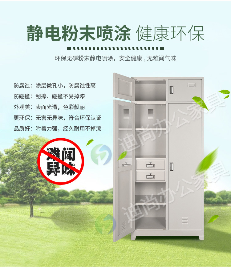 采用优质冷轧钢板经剪切,冲压,折弯,焊接,装配等九工位精制而成 采用自动喷淋式磷化 粉末静电喷涂,涂膜不易脱落,环保耐用,无毒害,无气味,光洁美观 外观精美,安全系数良好 坚固耐用,承受力强,可存放大量文件资料不变形