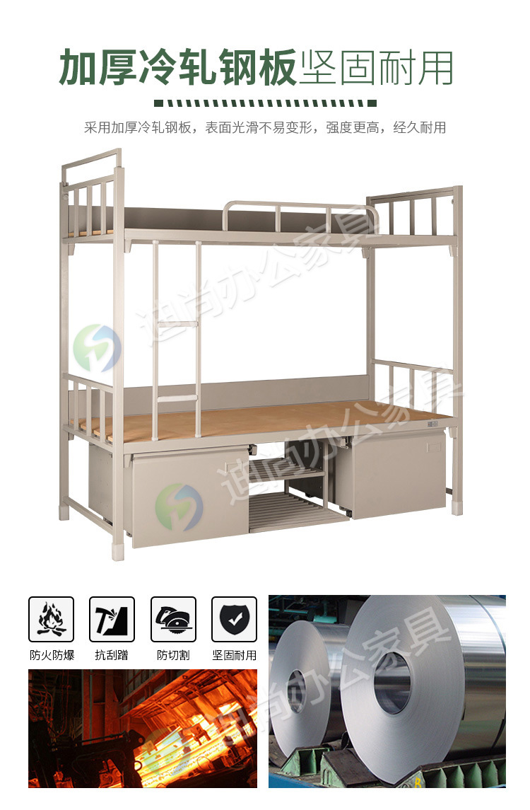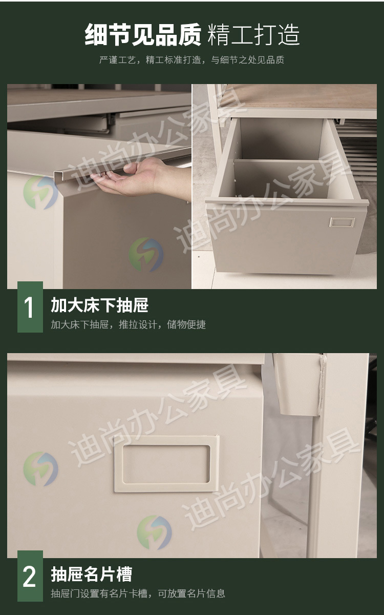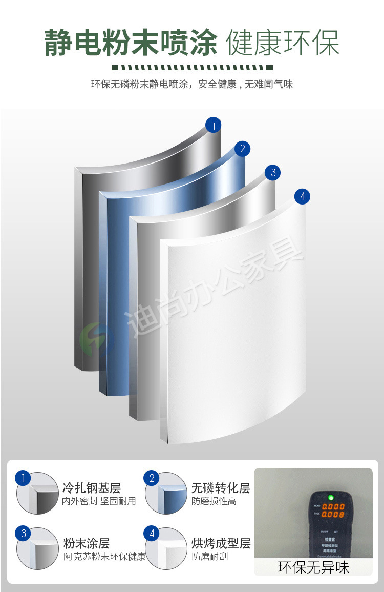 采用优质冷轧钢板经剪切,冲压,折弯,焊接,装配等九工位精制而成 采用自动喷淋式磷化 粉末静电喷涂,涂膜不易脱落,环保耐用,无毒害,无气味,光洁美观 外观精美,安全系数良好 坚固耐用,承受力强,可存放大量文件资料不变形