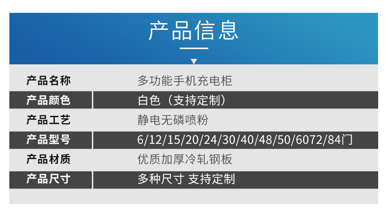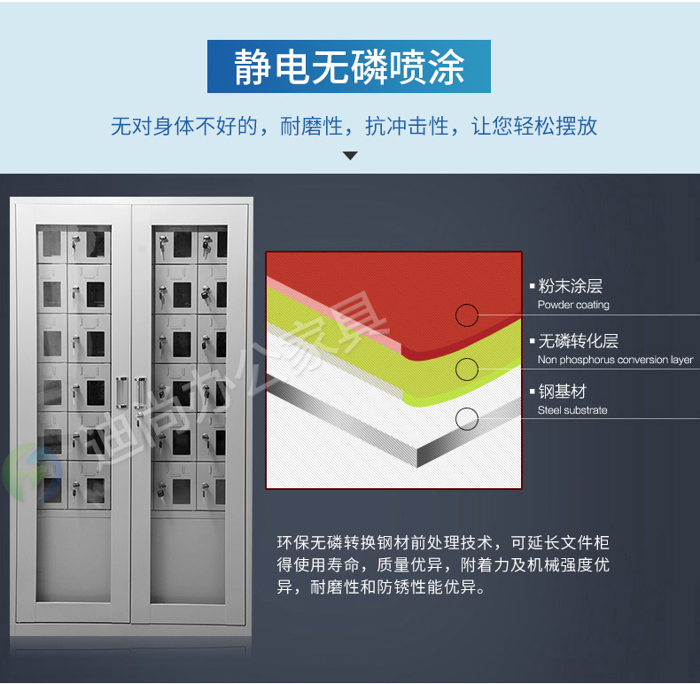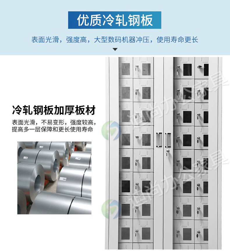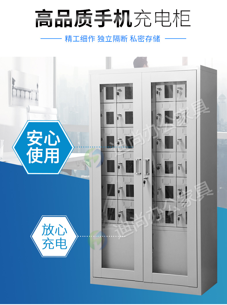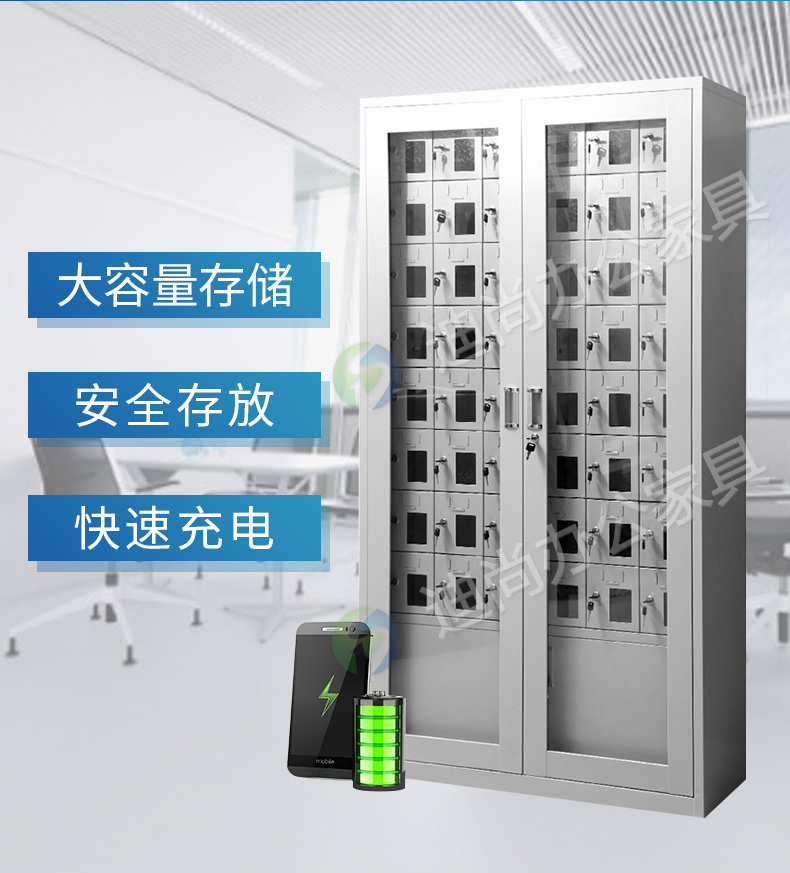 手机存放+手机充电 采用优质冷轧钢板经剪切,冲压,折弯,焊接,装配等九工位精制而成 采用自动喷淋式磷化 粉末静电喷涂,涂膜不易脱落,环保耐用,无毒害,无气味,光洁美观 外观精美,安全系数良好 坚固耐用,承受力强,可存放大量文件资料不变形
