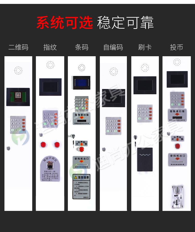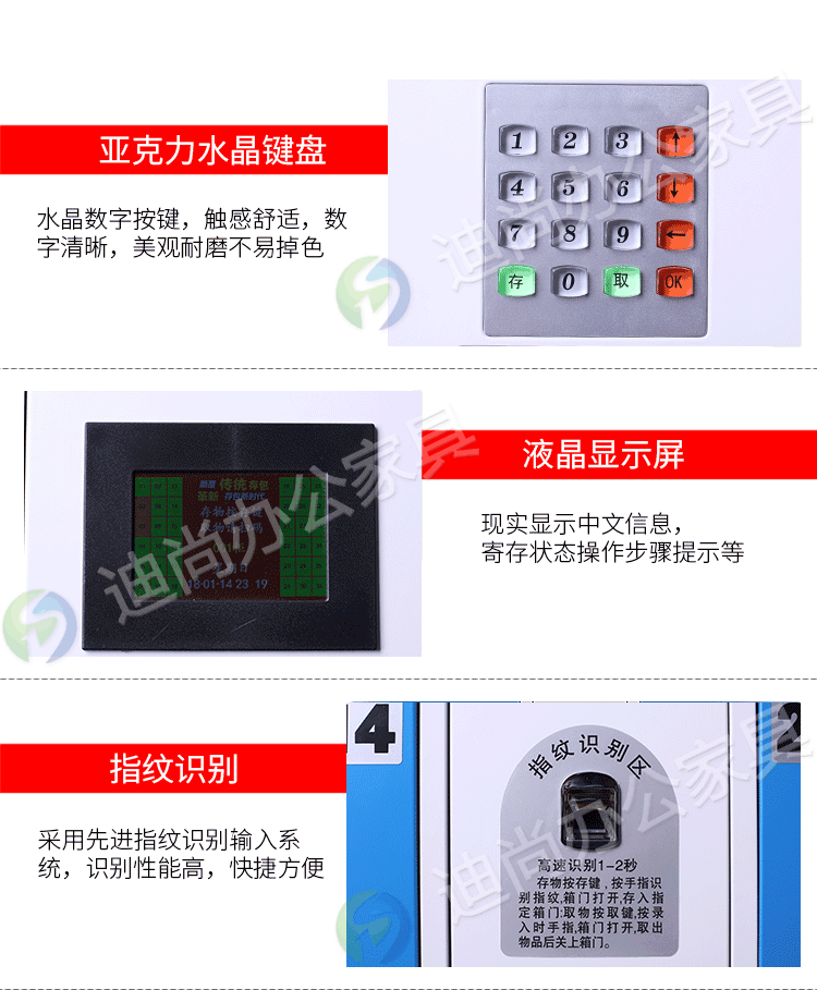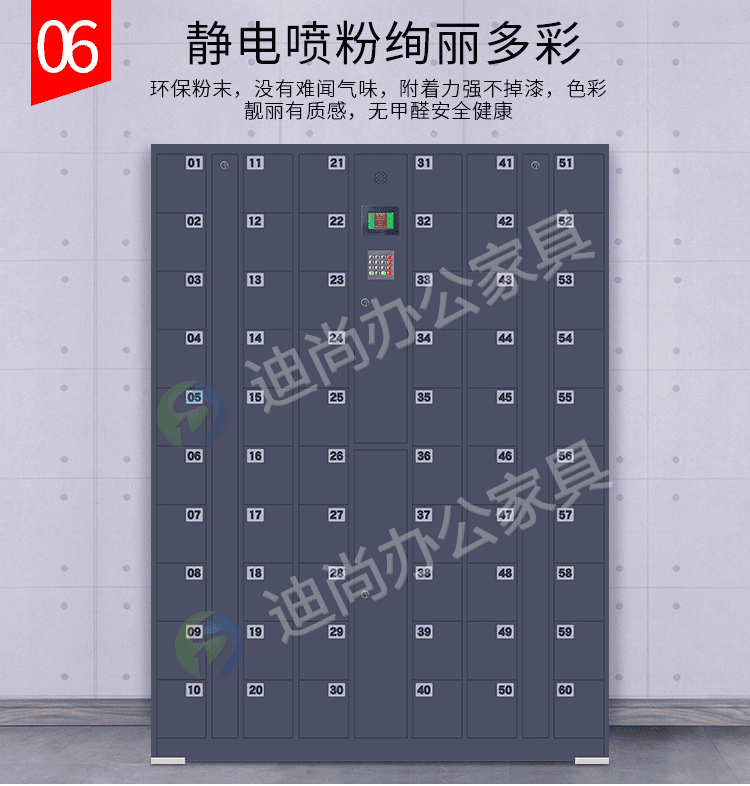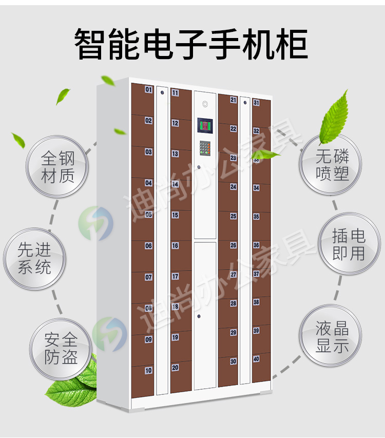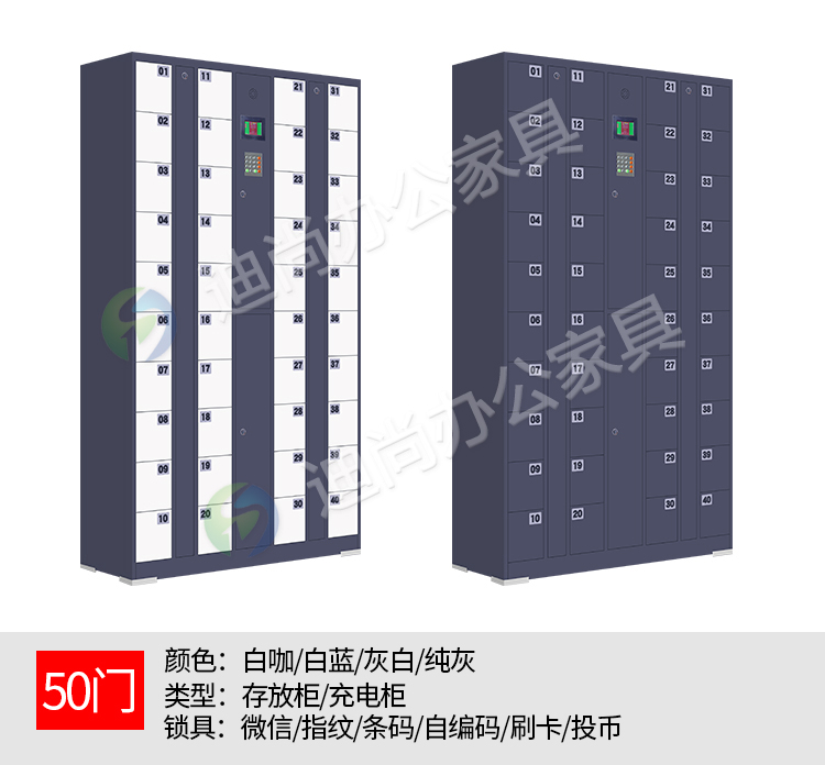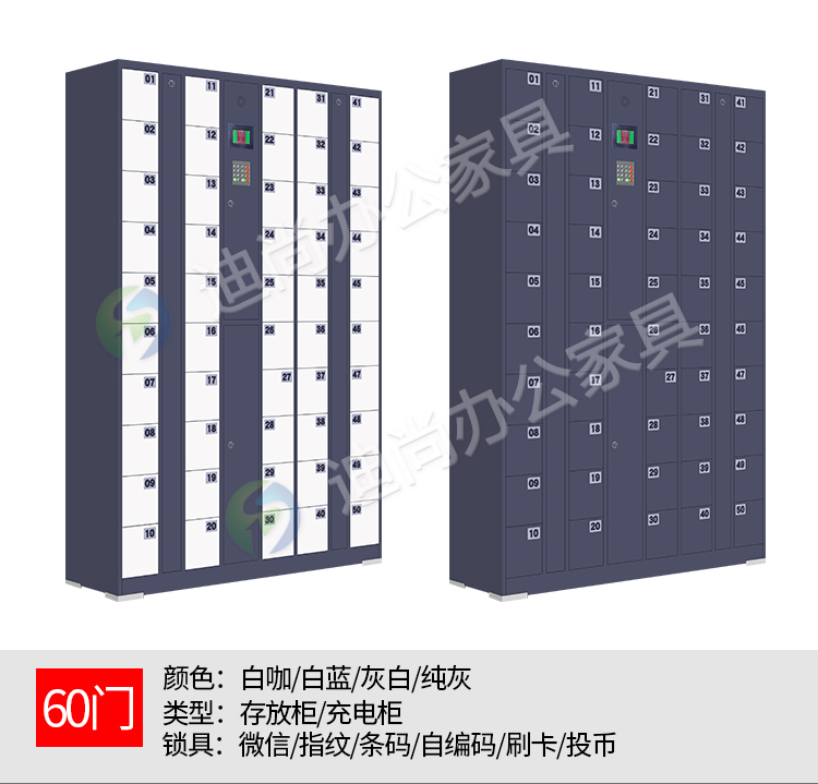 智能系统开门、链接后台开门,可使用指纹、刷卡、自设密码、人脸识别、微信扫码、条码、投币式开门方式 手机存放+手机充电 采用优质冷轧钢板经剪切,冲压,折弯,焊接,装配等九工位精制而成 采用自动喷淋式磷化 粉末静电喷涂,涂膜不易脱落,环保耐用,无毒害,无气味,光洁美观 外观精美,安全系数良好 坚固耐用,承受力强,可存放大量文件资料不变形