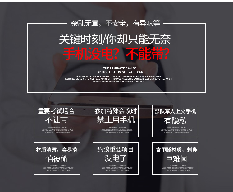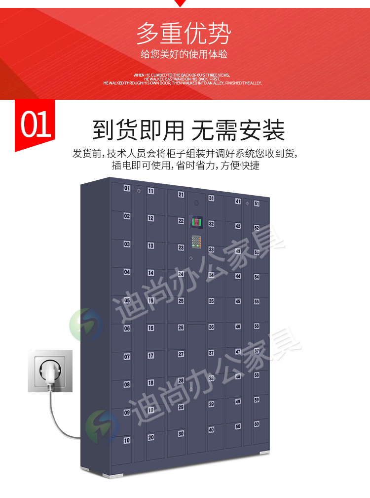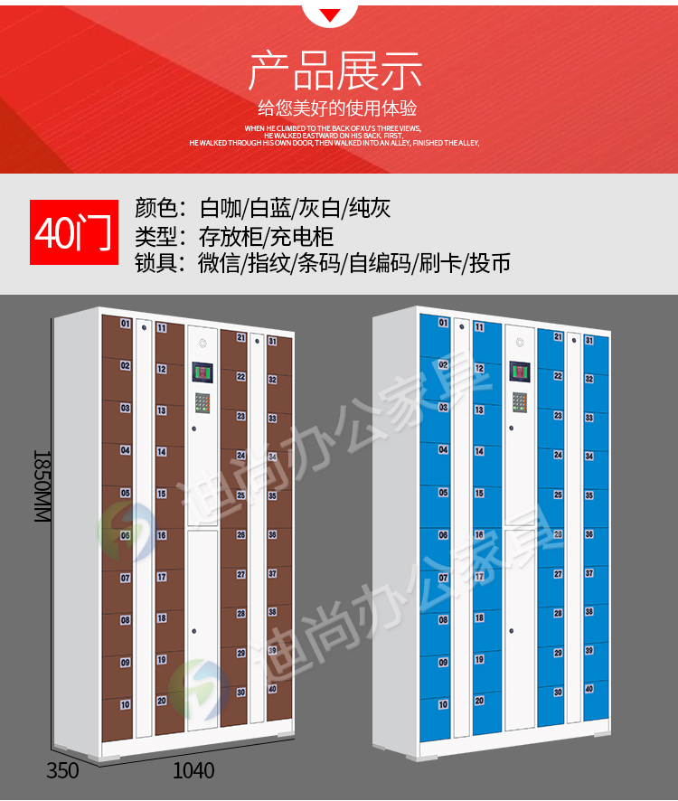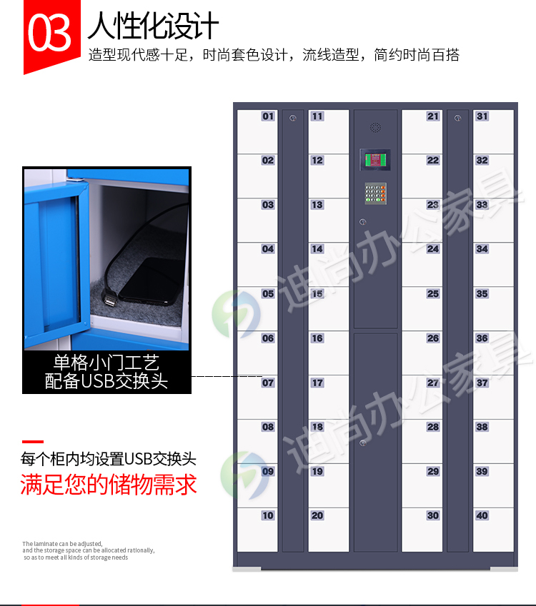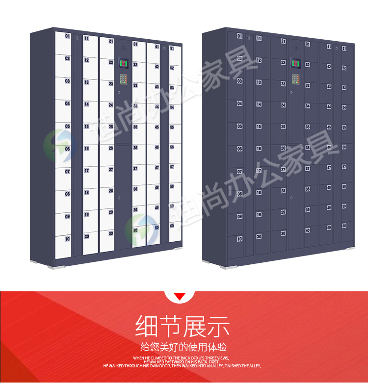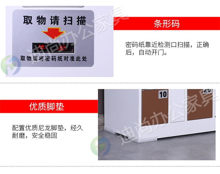 智能系统开门、链接后台开门,可使用指纹、刷卡、自设密码、人脸识别、微信扫码、条码、投币式开门方式 手机存放+手机充电 采用优质冷轧钢板经剪切,冲压,折弯,焊接,装配等九工位精制而成 采用自动喷淋式磷化 粉末静电喷涂,涂膜不易脱落,环保耐用,无毒害,无气味,光洁美观 外观精美,安全系数良好 坚固耐用,承受力强,可存放大量文件资料不变形