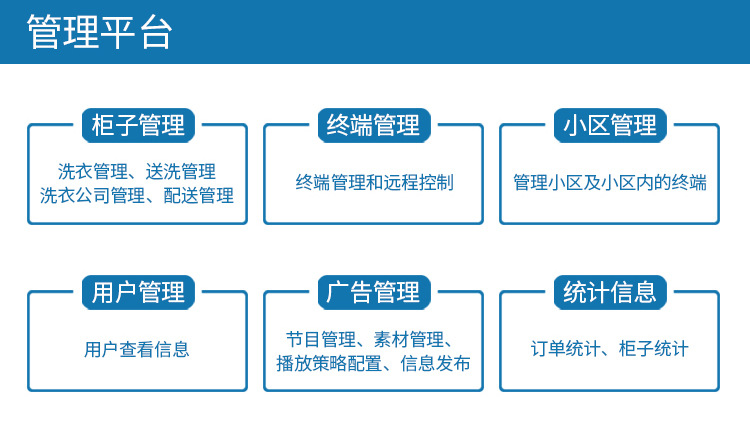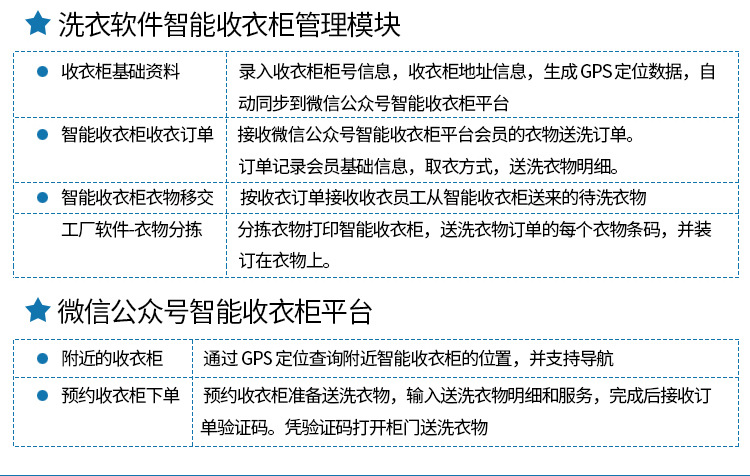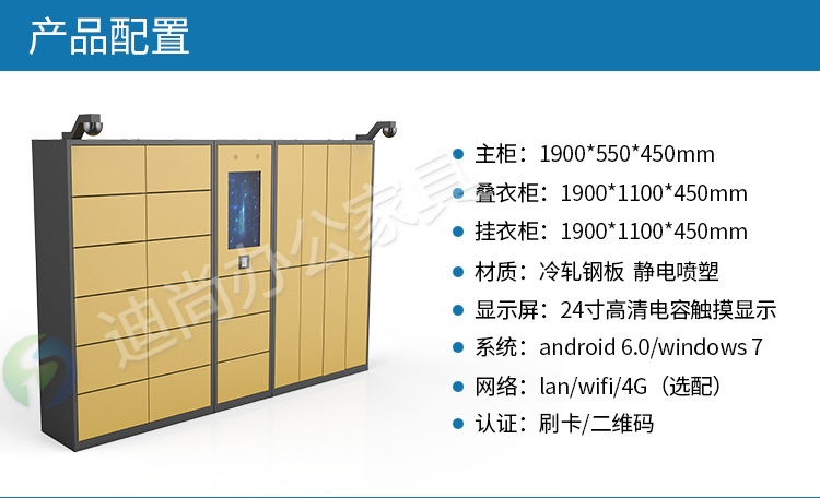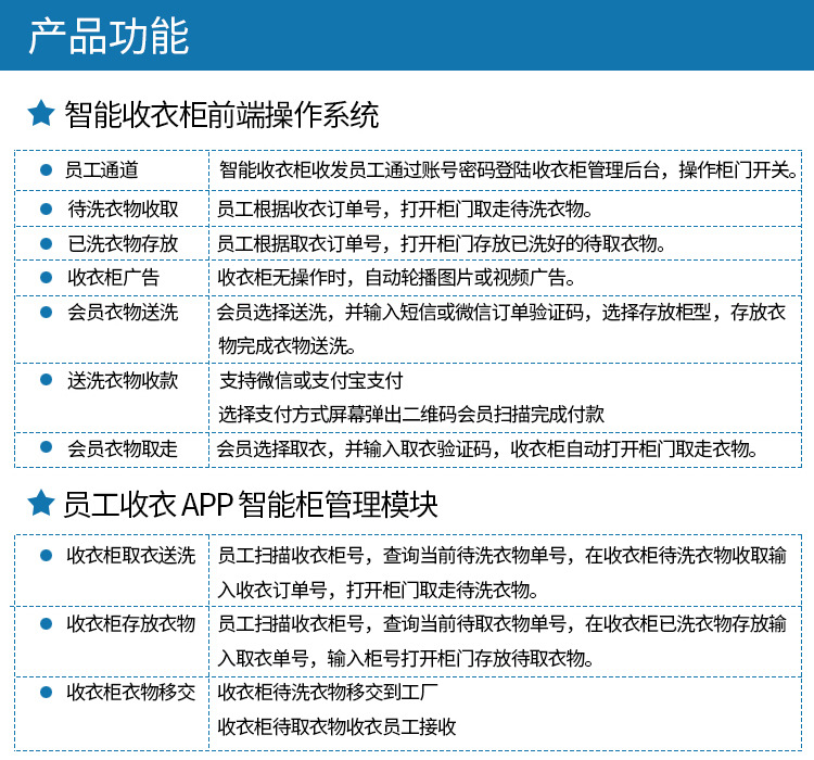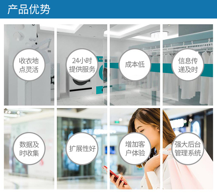智能收衣、智能发衣,节省客户必须到干洗店送衣物的烦恼 采用优质冷轧钢板经剪切,冲压,折弯,焊接,装配等九工位精制而成 采用自动喷淋式磷化 粉末静电喷涂,涂膜不易脱落,环保耐用,无毒害,无气味,光洁美观 外观精美,安全系数良好 坚固耐用,承受力强,可存放大量物品不变形