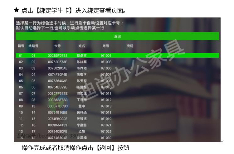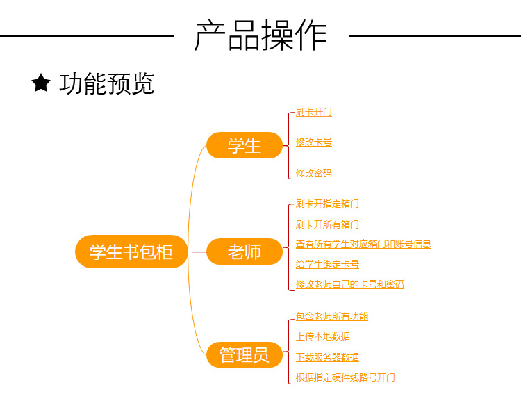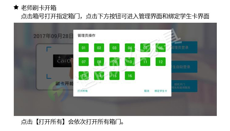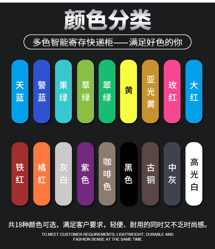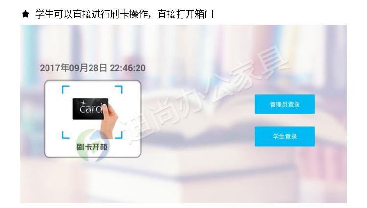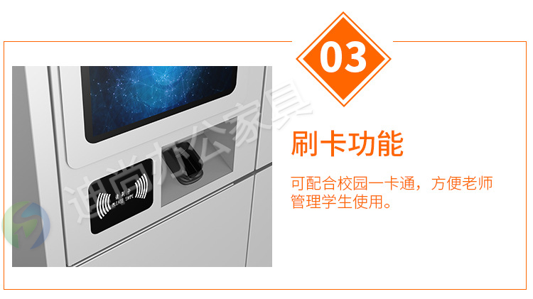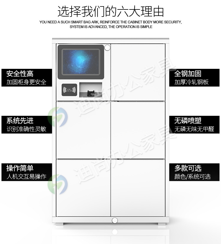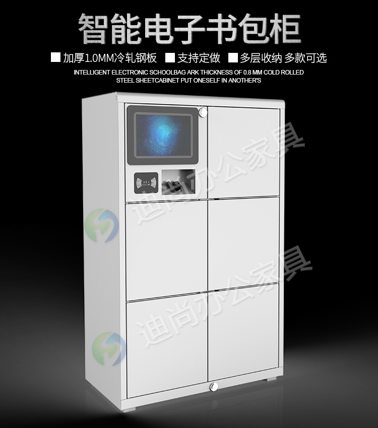 智能化管理学生书包存放问题,解决丢失钥匙烦恼 多种开门方式,可使用指纹、刷卡、自设密码、人脸识别、微信扫码、条码、投币式开门方式 采用优质冷轧钢板经剪切,冲压,折弯,焊接,装配等九工位精制而成 采用自动喷淋式磷化 粉末静电喷涂,涂膜不易脱落,环保耐用,无毒害,无气味,光洁美观 外观精美,安全系数良好 坚固耐用,承受力强,可存放大量物品不变形