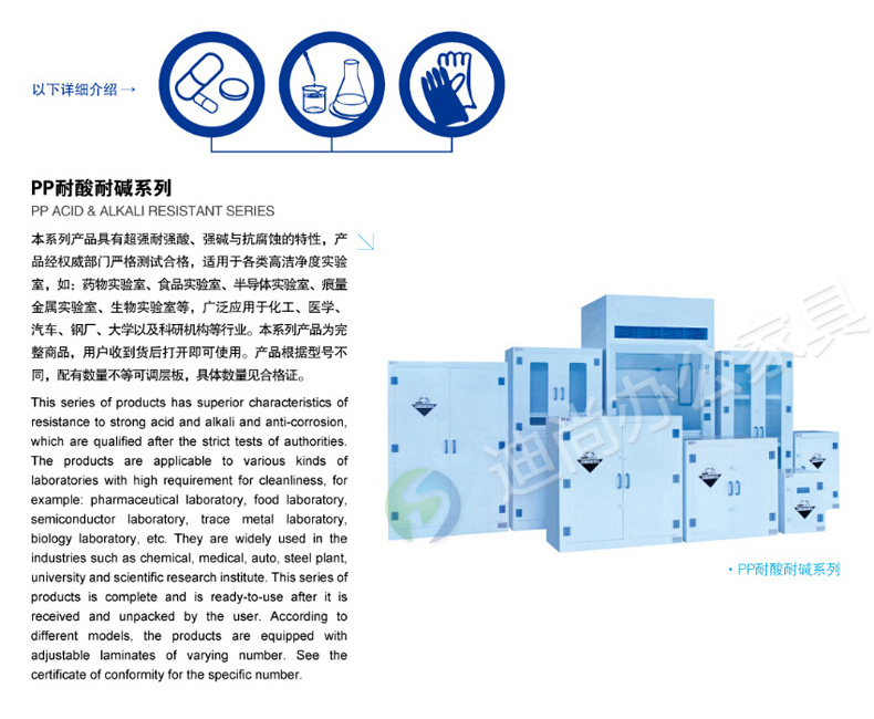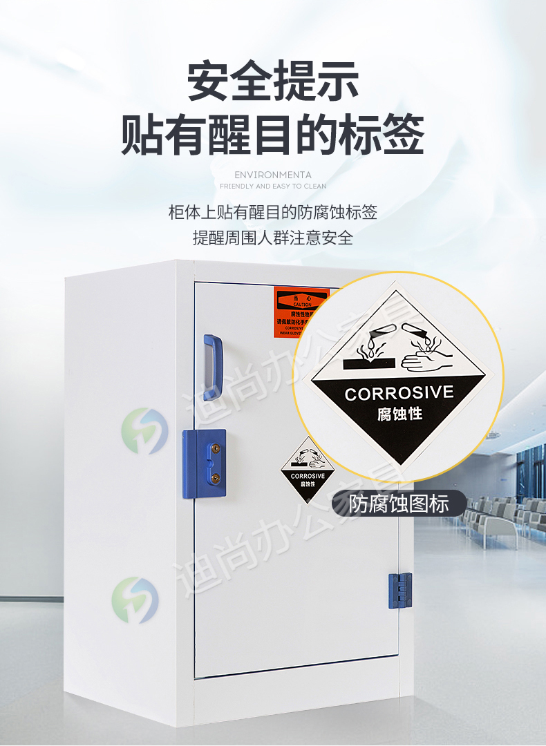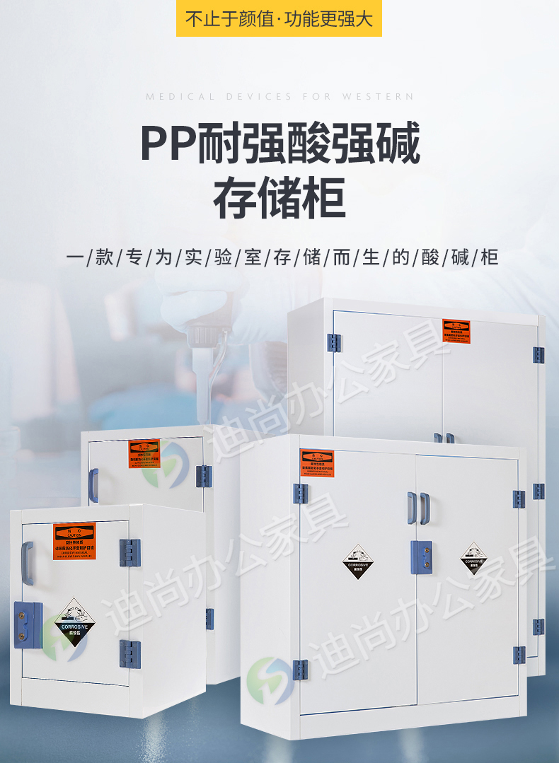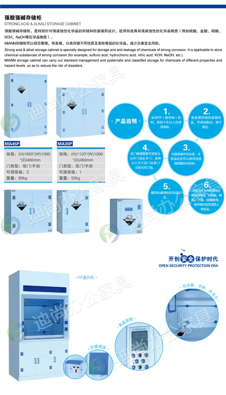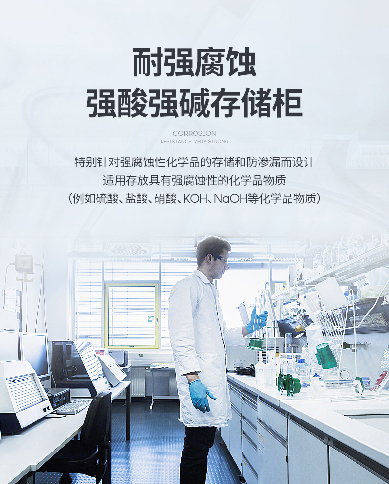 适用范围:实验室、医疗场所等 强酸强碱存储柜,特别针对强腐蚀性化学品的存储和渗漏而设计,可用于各种腐蚀性化学品的存储